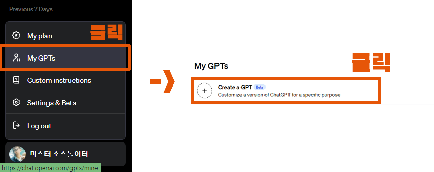 My GPTs를 등록하려면, 무료 사용자는 불가하고, Plus 또는 Team 플랜 혹은 엔터프라이즈 플랜을 구매한 유료 사용자여야 합니다.