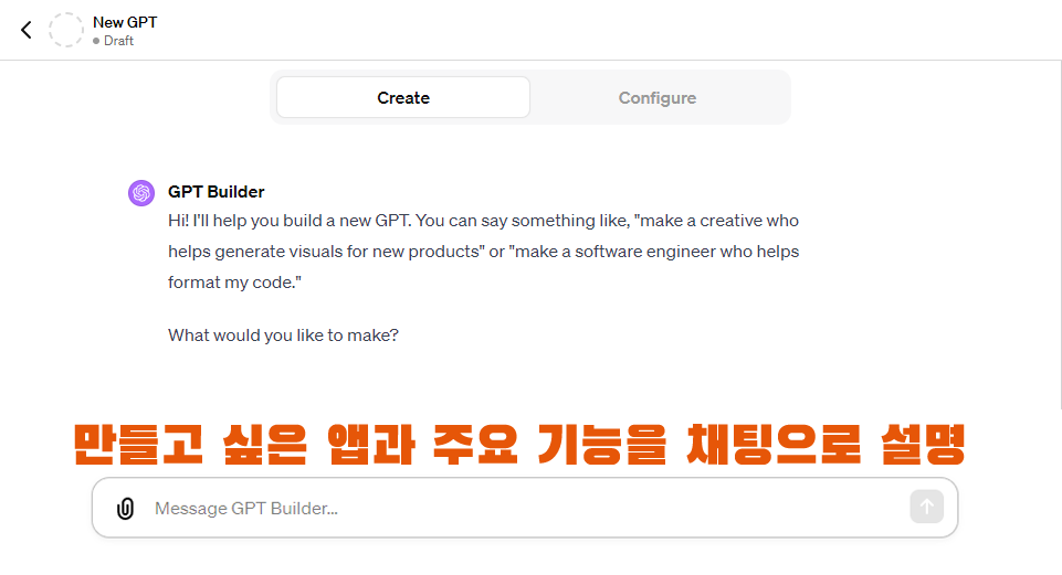 어떤 앱인지 상세히 설명하고 필요 조건 등을 설명하면 GPT가 완성됩니다.