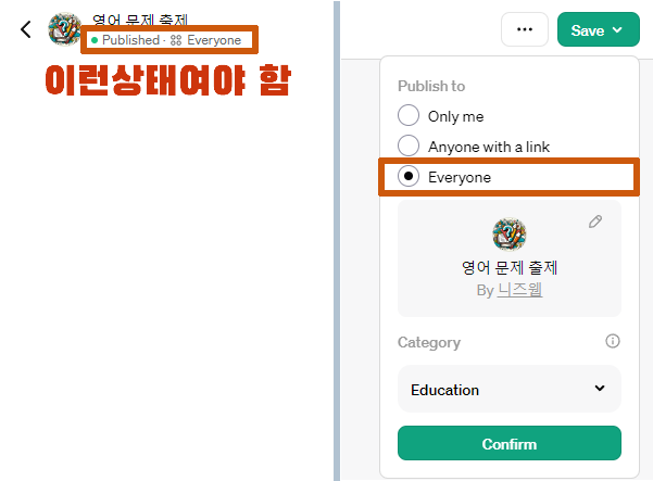 ("Everyone" 상태여야 함, 만약 "Anyone with a link" 선택 상태라면, 스토어에 공개되지 않습니다)