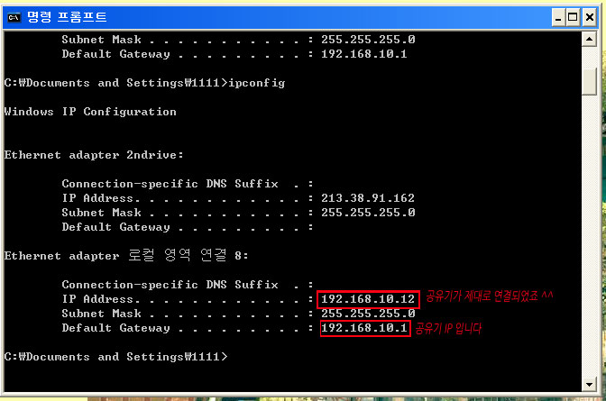 192.168.10.*, 192.168.1.*, 192,168.0.* 등이 잡힌다면 공유기는 제대로 작동하는 경우입니다.
