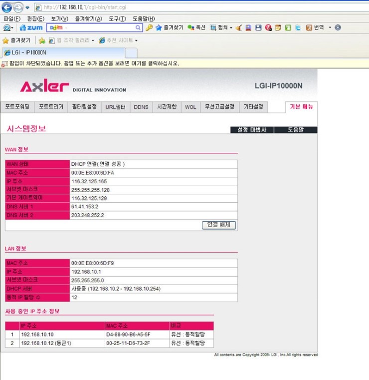 IP가 제대로 잡히나요? 아마 공유기 아이피가 잡힐텐데요 ~