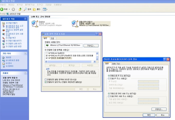 에 들어가 보시기 바랍니다. 그리고 자동으로 IP주소 받기, 자동으로 DNS 서버 주소 받기 가