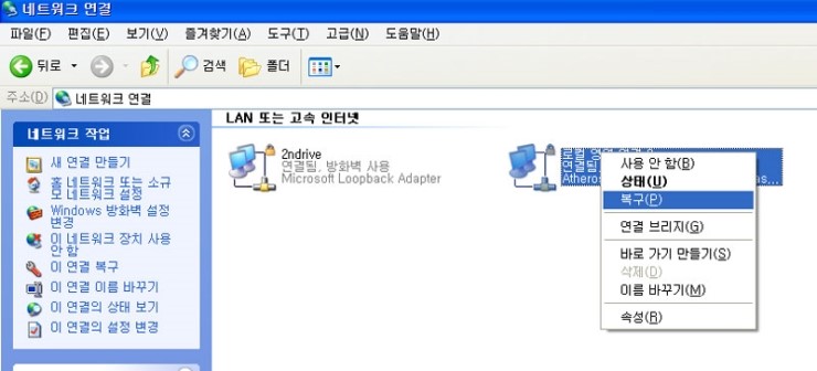 또 다른 방법으로는 로컬영역연결에서 오른쪽 마우스 클릭한 후 “복구”를 실행해주세요.