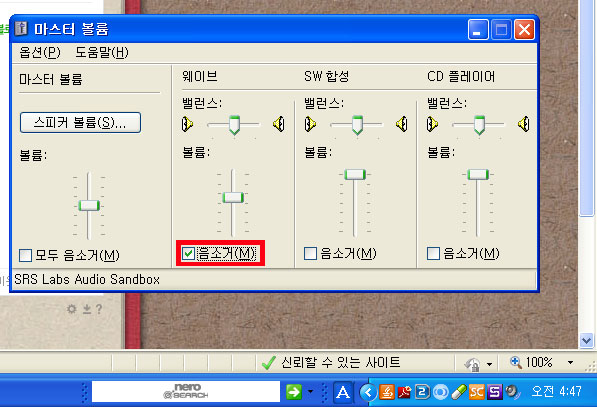 혹시 웨이브(Wave) 부분이나 스피커부분 또는 마스터볼륨이 음소거이거나 매우 낮게 설정되어 있진 않나 확인해주세요