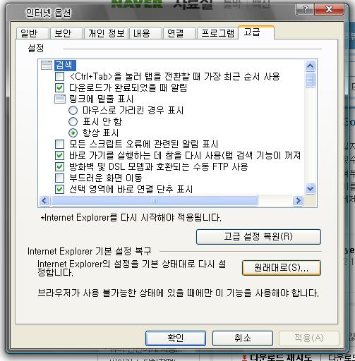 다음은 악성코드등이 깔려 있을 때 익스플로러 설정을 디폴트상태로 돌림으로.. 악성코드 작용을