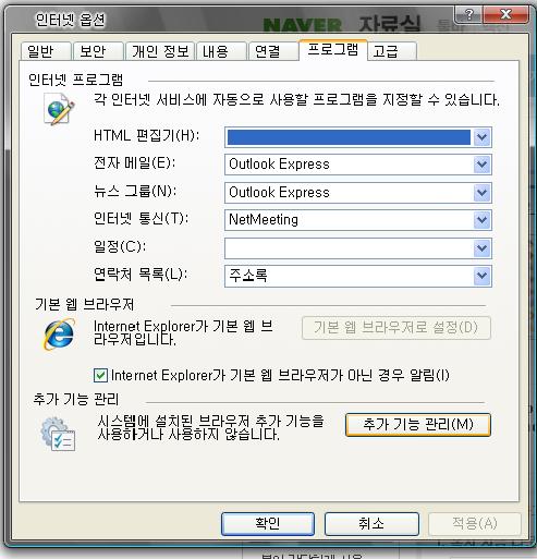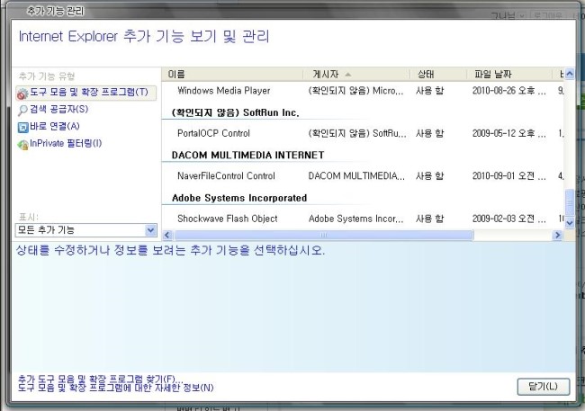 그 다음 프로그램을 확인하시구요. Flash, Naver, Microsoft Silverlight 처럼 믿을 수 있는 기능만 사용하고 나머지는 삭제해주시기 바랍니다. (표시 부분에서는 모든추가기능을 선택해주세요.)