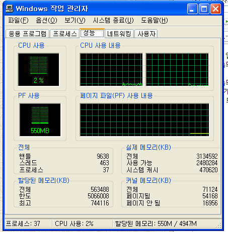제 컴퓨터의 작업관리자인데요. CPU 사용도 무척 낮고 PF 사용도 충분한 상태네요.